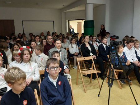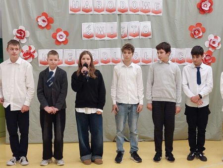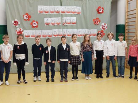 Narodowe Święto Odzyskania Niepodległości uczniowie klas 4-8 upamiętnili przedstawieniem słowno-muzycznym. Ósmoklasiści przedstawili rys historyczny święta, a uczniowie poszczególnych klas zaśpiewali pieśni patriotyczne: „My, Pierwsza Brygada”, „Rozkwitały pąki białych róż”, „Rota”, „Przybyli ułani pod okienko”, „Piechota”, „Wojenko, wojenko”. Podczas przedstawienia usłyszeliśmy również polską poezję: „Pieśń o fladze” K.I. Gałczyńskiego, „Polska” A. Słonimskiego, „Moja piosnka” C.K. Norwida.