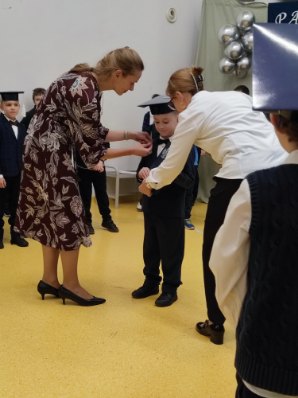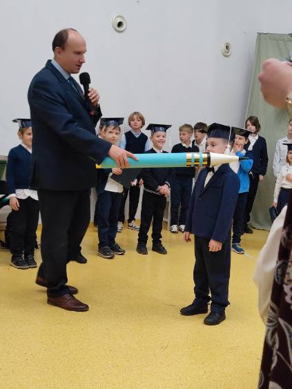 Po występie nadeszła chwila, na którą wszyscy czekali – a więc pasowanie wielkim ołówkiem przez Pana Dyrektora. O tym pięknym wydarzeniu uczniom przypominać będą otrzymane dyplomy oraz odznaki. Wszystkim pierwszoklasistom życzymy wielu sukcesów na nowej drodze obowiązków szkolnych.
